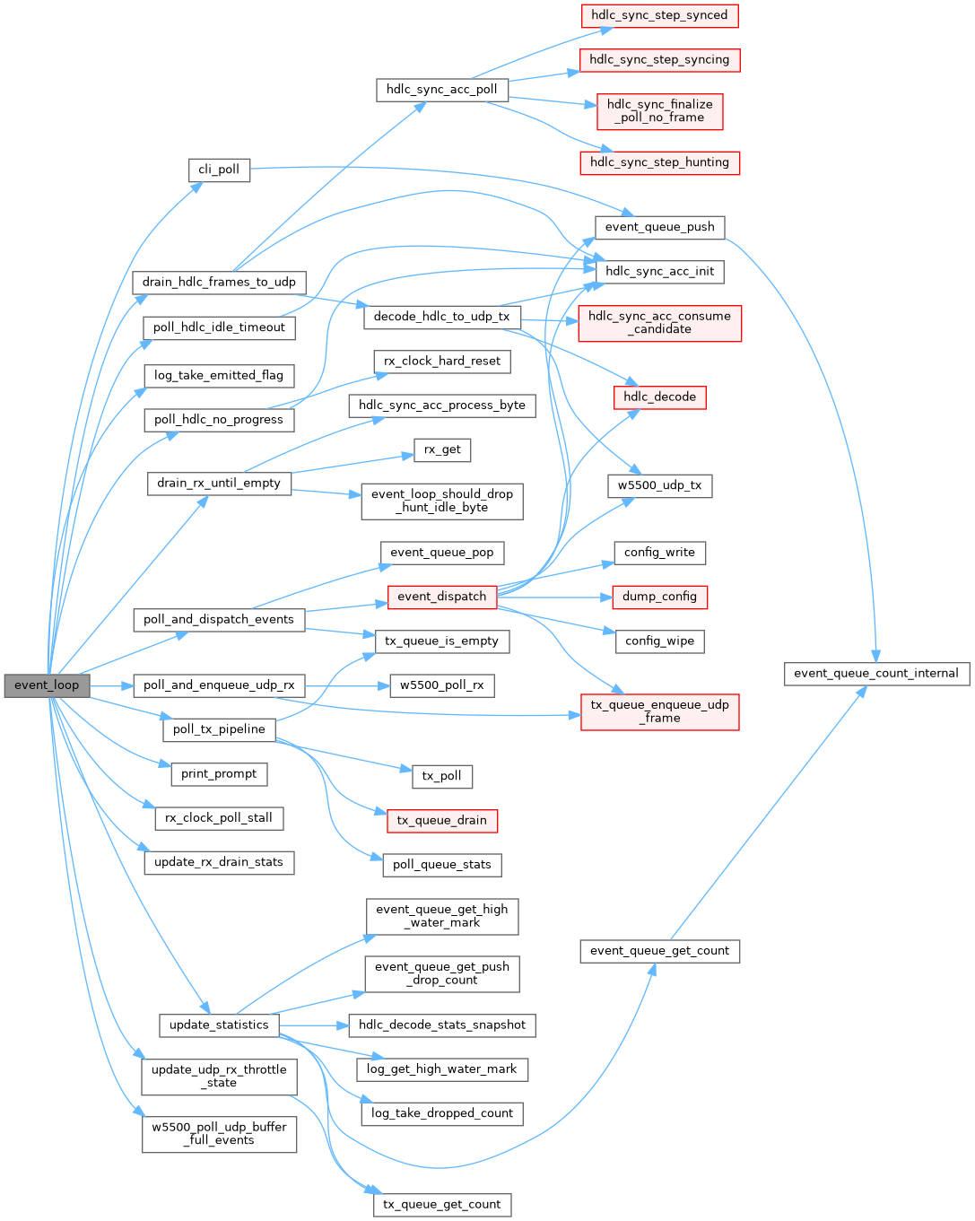 References cli_poll(), drain_hdlc_frames_to_udp(), drain_rx_until_empty(), log_take_emitted_flag(), MAIN_LOOP_SLEEP_US, app_ctx_t::need_prompt, poll_and_dispatch_events(), poll_and_enqueue_udp_rx(), poll_hdlc_idle_timeout(), poll_hdlc_no_progress(), poll_tx_pipeline(), print_prompt(), event_loop_runtime_t::rx_byte, rx_clock_poll_stall(), payload_statistics_t::rx_fifo_stall_events, app_ctx_t::stats, payload_statistics_t::udp_rx_buffer_full_counts, payload_statistics_t::udp_rx_throttle_skips, event_loop_runtime_t::udp_rx_throttled, payload_statistics_t::udp_tx_buffer_full_counts, update_rx_drain_stats(), update_statistics(), update_udp_rx_throttle_state(), w5500_poll_udp_buffer_full_events(), and event_loop_runtime_t::work_done.