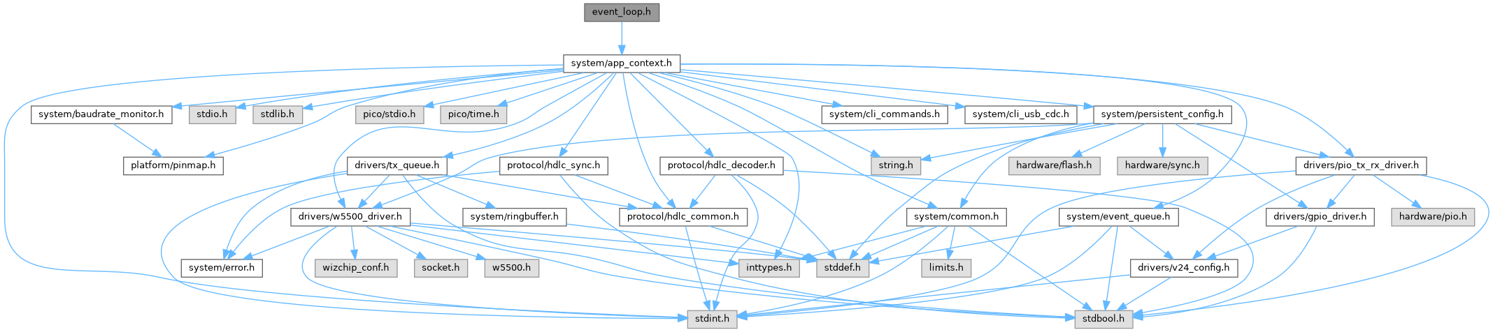 References cli_poll(), drain_hdlc_frames_to_udp(), drain_rx_until_empty(), log_take_emitted_flag(), MAIN_LOOP_SLEEP_US, app_ctx_t::need_prompt, poll_and_dispatch_events(), poll_and_enqueue_udp_rx(), poll_hdlc_idle_timeout(), poll_hdlc_no_progress(), poll_tx_pipeline(), print_prompt(), event_loop_runtime_t::rx_byte, rx_clock_poll_stall(), payload_statistics_t::rx_fifo_stall_events, app_ctx_t::stats, payload_statistics_t::udp_rx_buffer_full_counts, payload_statistics_t::udp_rx_throttle_skips, event_loop_runtime_t::udp_rx_throttled, payload_statistics_t::udp_tx_buffer_full_counts, update_rx_drain_stats(), update_statistics(), update_udp_rx_throttle_state(), w5500_poll_udp_buffer_full_events(), and event_loop_runtime_t::work_done.